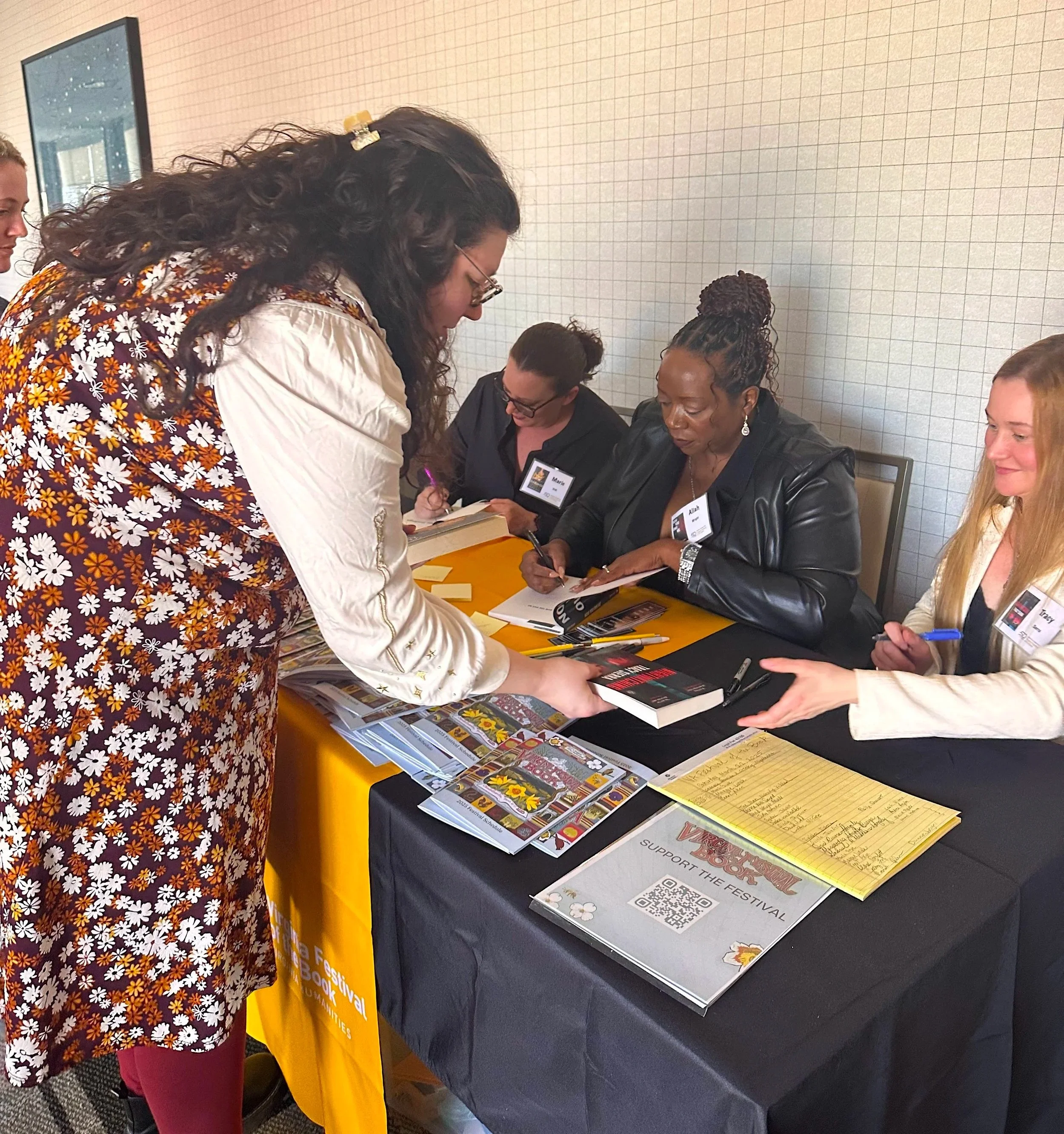 Signing books for a sold-out crowd at a book festival in Virginia with from left, authors Marie Still (My Darlings) and Tracy Sierra (Nightwatching).